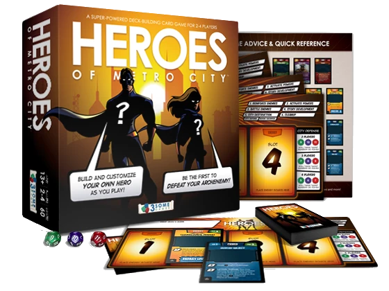 Heroes of Metro City is a deck-building card/board game in which each player represents a super-powered Hero of his own design who must stop their Archenemy’s nefarious plan to destroy Metro City. Devastate your enemies with thousands of possibilities and choices for your character. The base game includes over twenty explosive Power cards and many iconic Energy Sources, and a randomized subset of these will be selected for each game. It’s an exciting array of possibilities for your customized super-powered Hero.