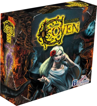 Coven is a game of secret alignments for 3-5 players in which each player represents a Witch serving either the darkness or the light. Not only is your starting alignment a secret, but each of the five non-player Goddesses has an unknown alignment as well. Deducing which Goddess(es) and which other player(s) share your alignment will make your strategy clear and victory easier to achieve, but not guaranteed by any means. Gameplay is deceptively simple, with five possible actions as players traverse a circular board with an inner pentagram rotating widdershins changing tactics with each rotation. Coven presents an interesting strategic challenge: the side (Light or Dark) that scores the most Balance defeats the opposing side — but on the dominating side, only the Witch that scores the most Power can win, so players must be careful not to invest too much in one while neglecting the other.