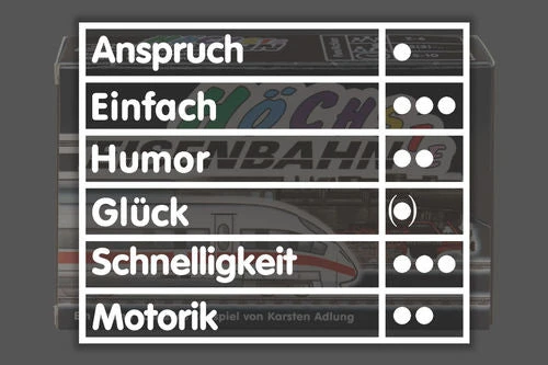 Höchste Eisenbahn can be played at different difficulty levels so that newcomers and train masters can compete together. The game also includes variant rules to allow children as young as three to play.