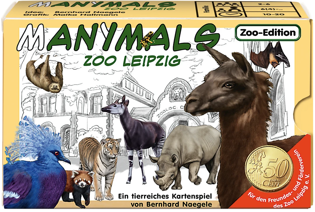 Manimals: Zoo Leipzig includes rule variants that allow for play with children as young as four, and for each copy of Manimals sold, Adlung-Spiele will donate fifty cents to “für den Freundes- und Förderverein des Zoo Leipzig e. V.” for animal protection.