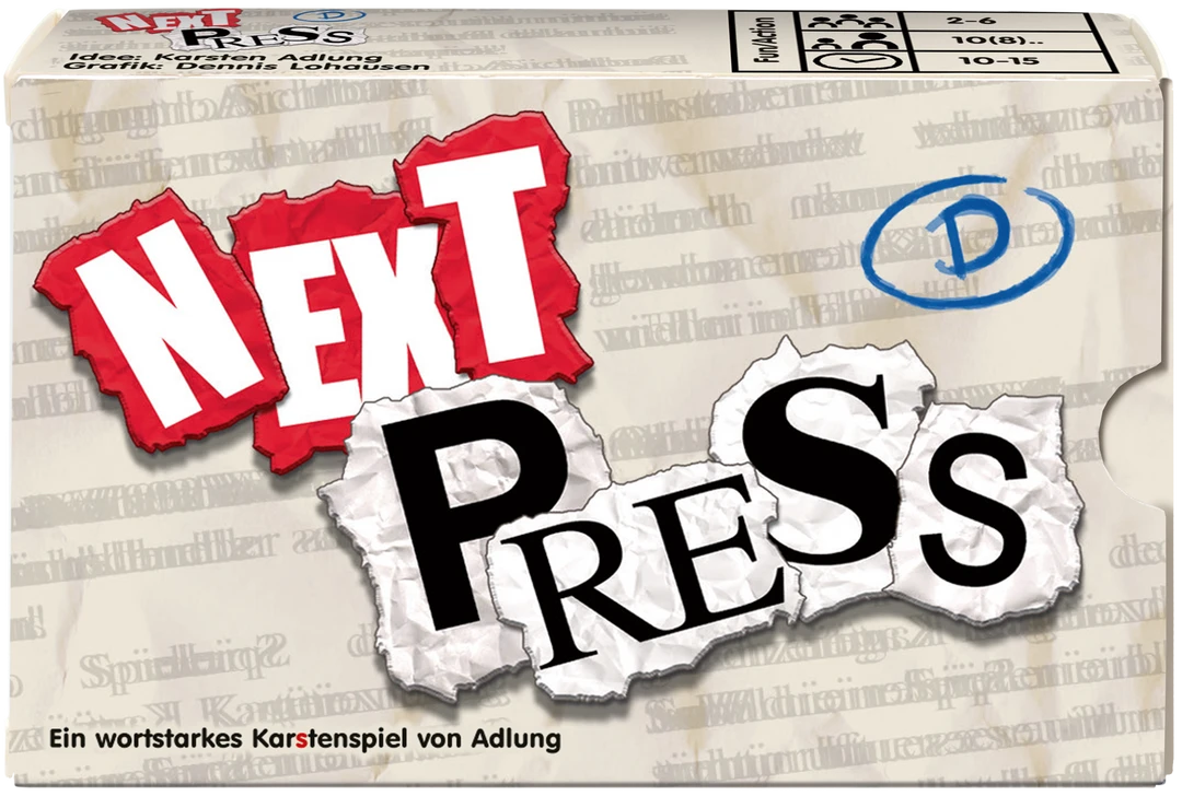 In NextPress, all players reveal cards simultaneously each round, with the cards having letters on them. As soon as a player discovers a word, they call out and claim it on their victory pile — but because all visible letters are allowed to be used by all players in future rounds, the topmost card on each victory pile is not safe from being stolen!