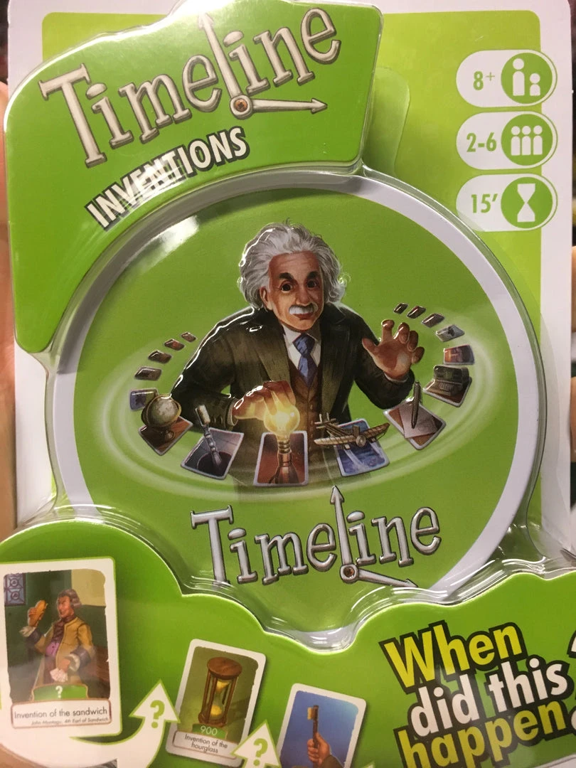 Timeline: Inventions is a card game played using 109 cards. Each card depicts an invention on both sides, with the year in which that invention was created on only one side. Players take turns placing a card from their hand in a row on the table. After placing the card, the player reveals the date on it. If the card was placed correctly with the date in chronological order with all other cards on the table, the card stays in place; otherwise the card is removed from play and the player takes another card from the deck.