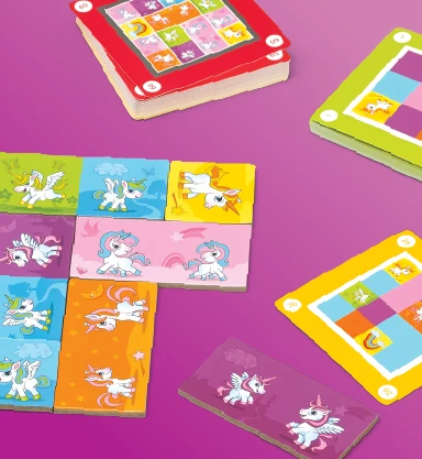 The Mindo Collection consists of 4 clever puzzles; can you collect and master them all? Play solo, or combine them and race your friends. No matter which version you choose the rules are the same: turn and flip the double-sided tiles until you have recreated the color pattern on the challenge card. They only fit one way into a 3×3 or 4×4 grid, so think and plan carefully. 60 different challenge cards and 4 levels of difficulty ensure hours of brain teasing fun!