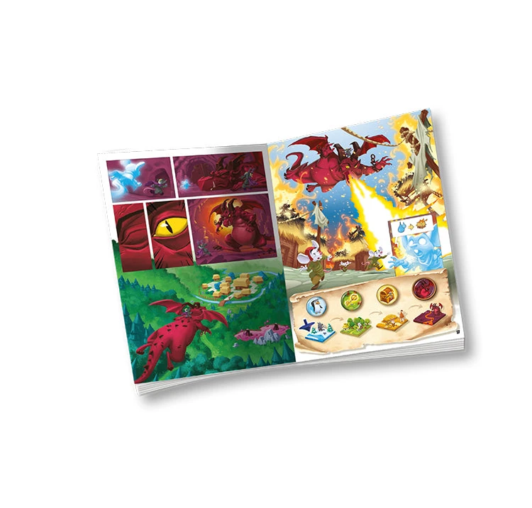 In the cooperative family game Ghost Adventure, players guide a spinning top across several game boards and must complete tasks on them to successfully complete missions. For each of the 56 missions, a different route must be completed with the spinning top. The double-sided boards show eight different worlds and a variety of goals to reach without stopping the spinning top (too often).