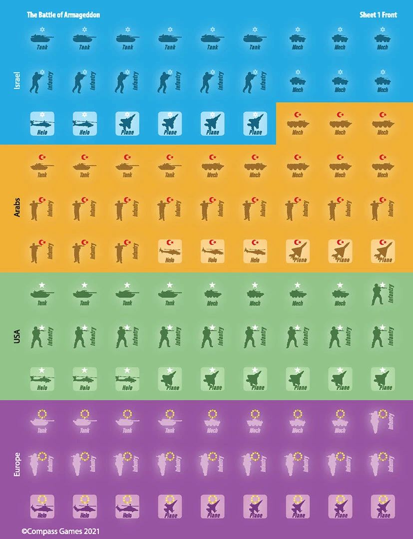 The 19 x 33″ game map represents the battleground, stretching from Egypt to Iran. The 216 5/8″ counters (die-cut and back-printed) represent the armies of Israel, the Arabs, Magog (Russia), the Revived Roman Empire (Europe), USA and the Kings of the East (China). The 149 playing cards capture apocalyptic events (7 seals, 7 trumpets, 7 vials), special powers (e.g. the Anitchrist, Gog of Magog, etc.), nuclear weapons (tactical, theatre, and strategic) and homeland populations. Battle dice are used to resolve all battles.