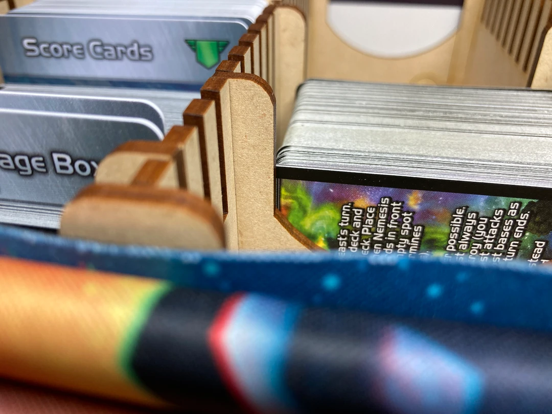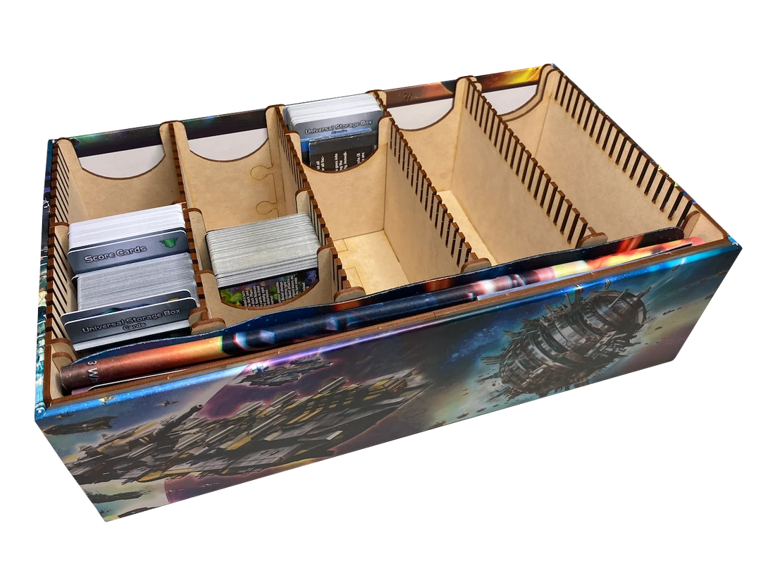 Our storage solution for the Star Realms Universal Storage Box takes a great start and makes it even better. Our solution offers 895mm of card storage in five lanes and stores a play mat.