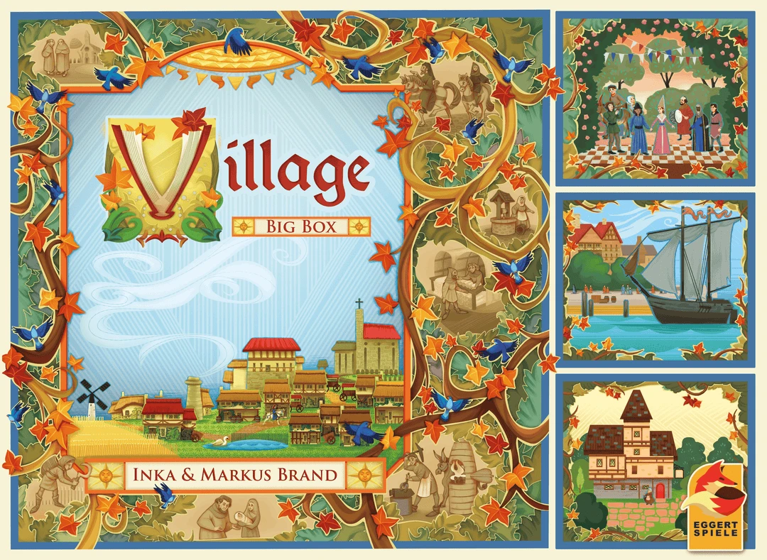 Village: Big Box contains the Village base game, the Inn and Port expansions, every promo previously released, and a new “Marriage” expansion, with all of the materials being integrable with one another and with the game now containing a solo mode as well as revised gameplay, dual-layered player boards, and a larger, double-sided main board that eliminates the need for the overlays used in the original expansions.