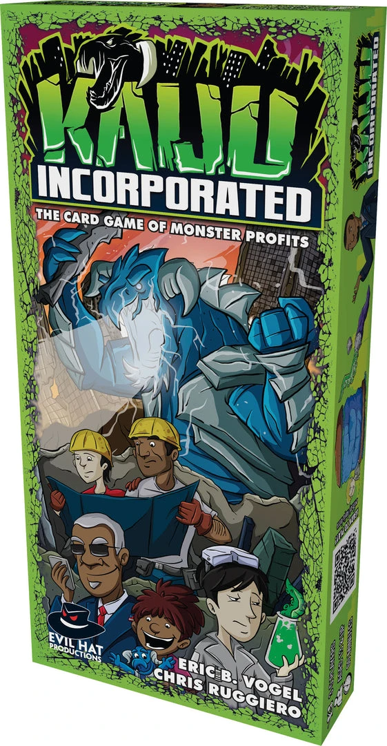Kaiju Incorporated is a card drafting, economic game. Each turn players draft a building card and either pay to add it to their tableau or discard it to generate income for themselves and other players. Player’s buildings also generate research, which enables them to draft new product cards. The new product cards score victory points based on the building cards in their tableau. However, generating income can also cause the Kaiju to attack you, destroying buildings or causing other kinds of mischief.