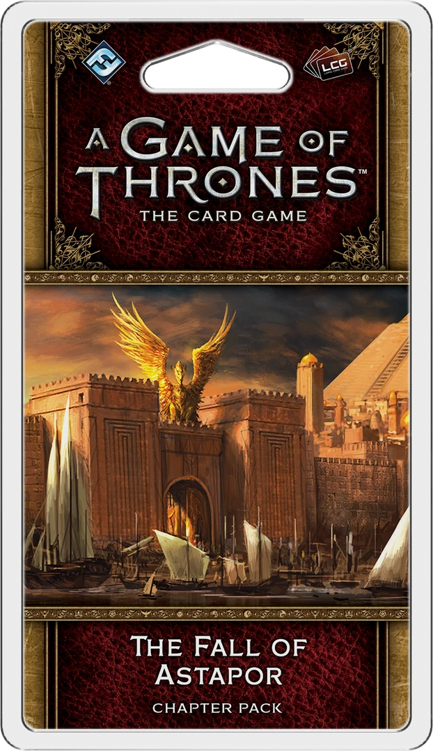 Bloody plots consume the Seven Kingdoms as Daenerys Targaryen liberates Astapor in the manner of Old Valyria — with fire and blood! The Fall of Astapor is the third Chapter Pack in the “Blood and Gold” cycle for A Game of Thrones: The Card Game, continuing the saga of A Song of Ice and Fire into A Storm of Swords. Within this pack, you’ll find more cards focusing on the new bestow keyword, powerful new economy, and the subtly growing influence of House Frey. You’ll even have the chance to add iconic characters and locations to your deck, including Grey Worm, The Twins, and Theon Greyjoy.