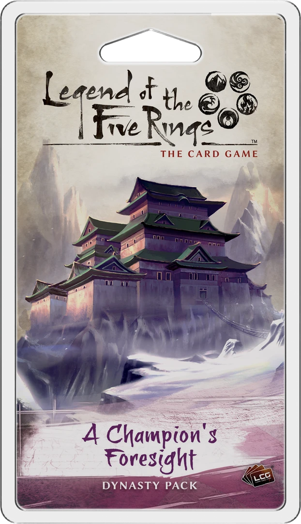 Discover the secrets of the Dragon in A Champion’s Foresight, the fifth Dynasty Pack in the Inheritance cycle for Legend of the Five Rings: The Card Game! A Champion’s Foresight continues the themes of the Inheritance cycle, lending support to the Bushi and Courtiers of Rokugan. It also introduces two new provinces and a new stronghold for the enigmatic Dragon Clan.