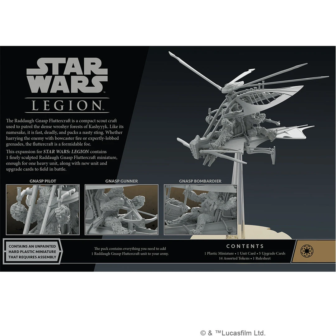 Defend Kashyyyk with the Raddaugh Gnasp Fluttercraft Unit Expansion for Star Wars: Legion! A compact scout craft used to patrol the dense wroshyr forests of Kashyyyk, this fluttercraft is fast, deadly, and packs a nasty sting. Whether harrying the enemy with bowcaster fire or expertly- lobbed grenades, the fluttercraft is a formidable addition to the Wookiee arsenal.