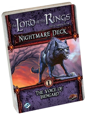60 card print-on-demand deck containing the cards needed to play the three scenarios for the Voice of Isengard expansion in nightmare mode. A copy of both The Lord of the Rings: The Card Game core set and the Voice of Isengard boxed expansion are required to play.