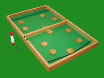 A fun dexterity game that can be played in only a few minutes. The board is split in two by a wall with a small gap in the center. Your objective is to be the first to shoot your disks though the gap using the elastic band stretched across your back wall.
