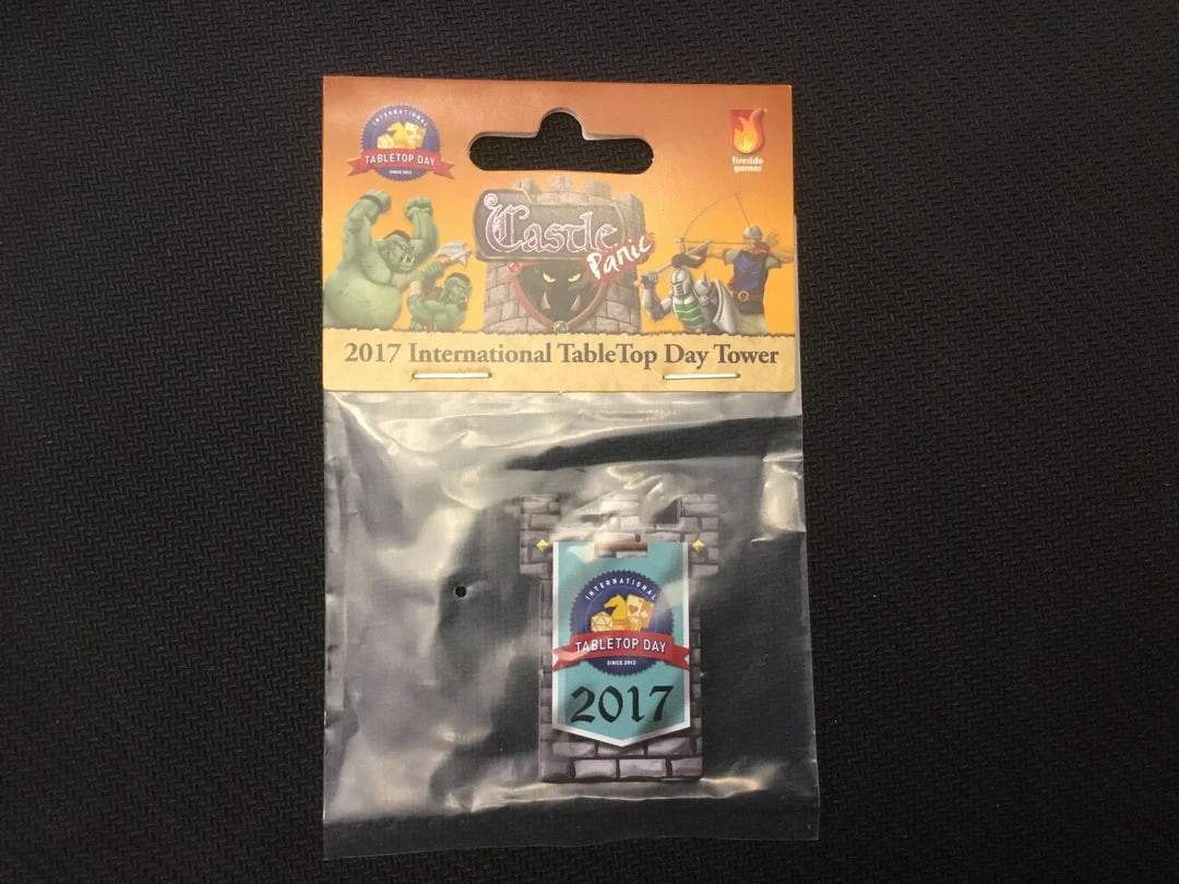 The International Tabletop Day 2017 Tower is the third in the series for Castle Panic fans. Players replace 1 of the original Towers with this collector’s Tower. When it’s destroyed during the game, everyone draws up to a full hand and trades a card.