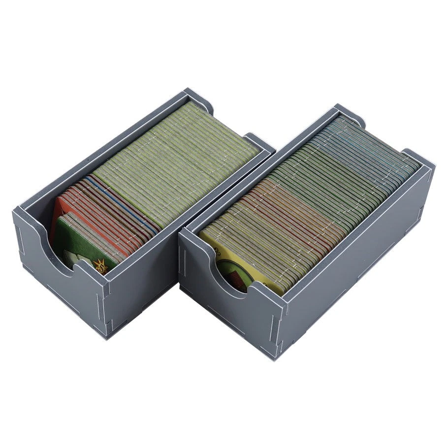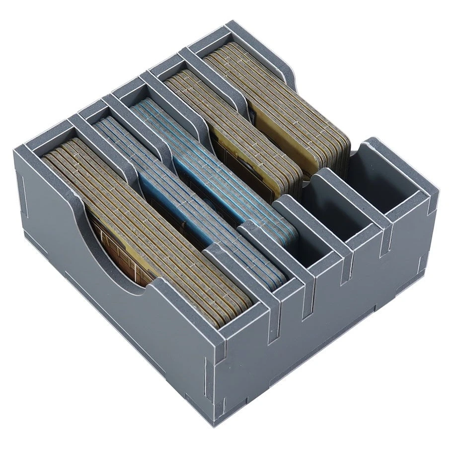 Insert compatible with Fields of Arle® and the Tea & Trade® expansion. The design provides both efficient storage and improved game play. Many of the trays can be utilized during the game, and they greatly aid set-up and clear-away times. The rule books and boards act as a lid on top of the trays.