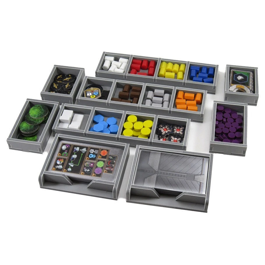 Insert compatible with Gaia Project®. The design provides both efficient storage and improved game play. The trays can be utilized during the game, and they greatly aid set-up and clear-away times. The rules and boards act as a lid on top of the trays.