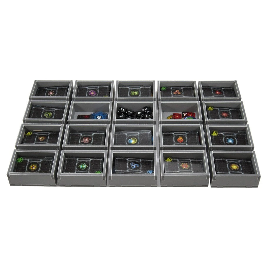 Insert compatible with Twilight Imperium 4th Edition®, and has space provided for future expansions. The design provides both efficient storage and improved game play. Many of the trays can be utilised during the game, and they greatly aid set-up and clear-away times. The rules and boards act as a lid on top of the trays.