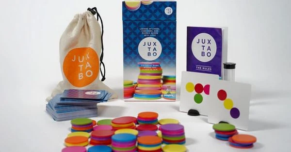 Juxtabo features 126 discs, each with one of seven colors on one side and a different color on the other side. Several discs are chosen randomly to form a grid to start the game, and each player receives seven discs as his hand. Players also receive two challenge cards, each of which shows a pattern consisting of either three or four discs.