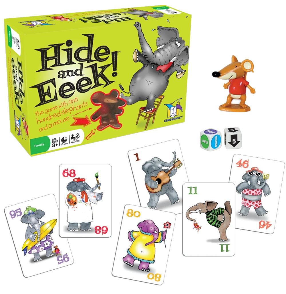One hundred giant elephants are running amok, but one tiny mouse has got their number! Roll the dice and move the mouse around the board, searching high and low for elephants that are either higher or lower than the number on your card. If you spot a mouse hiding on a card, shout Eeek!and grab the mouse figurine before it scampers away! You’ll need to have a memory like an elephant and be quick as a mouse to win!