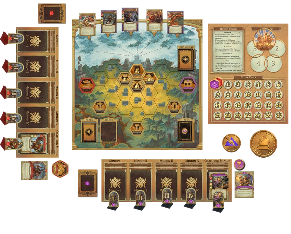 Command your forces during the action phase. Manage Minion actions for combat, area control, and tactical advantage. Send your Minions to the Greek Isles to recruit epic heroes and monsters of legend, such as Medusa, Perseus, and Pegasus. Organize your forces wisely. Positioning is key to victory!