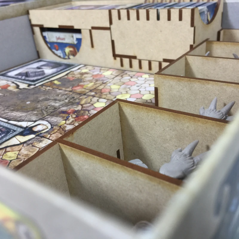 - This insert provides seven (7) removable trays. There is clearance at the top for your boards and rulebooks.