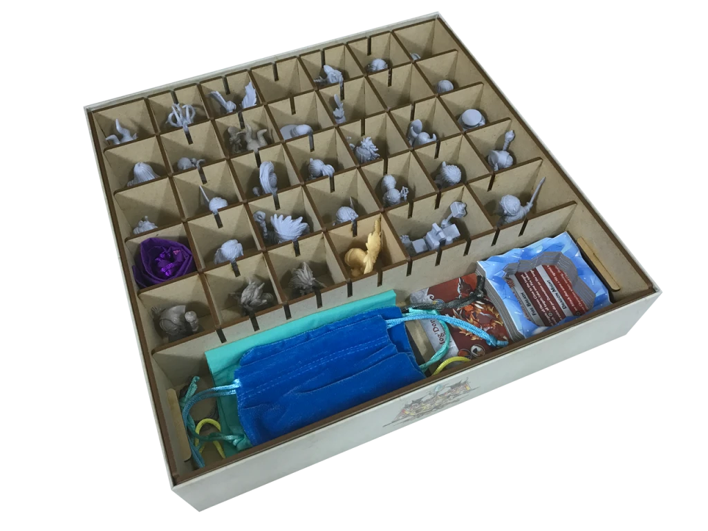 Our storage solution for Arcadia Quest: Inferno Hell of a Box provides storage for minis, dragon tokens, jumbo cards, dice bags, and other items. This solution is designed to be placed in a Hell of a Box. If you received a Hell of a Box as part of your Kickstarter pledge, you will definitely benefit from the minis and card storage with this solution.