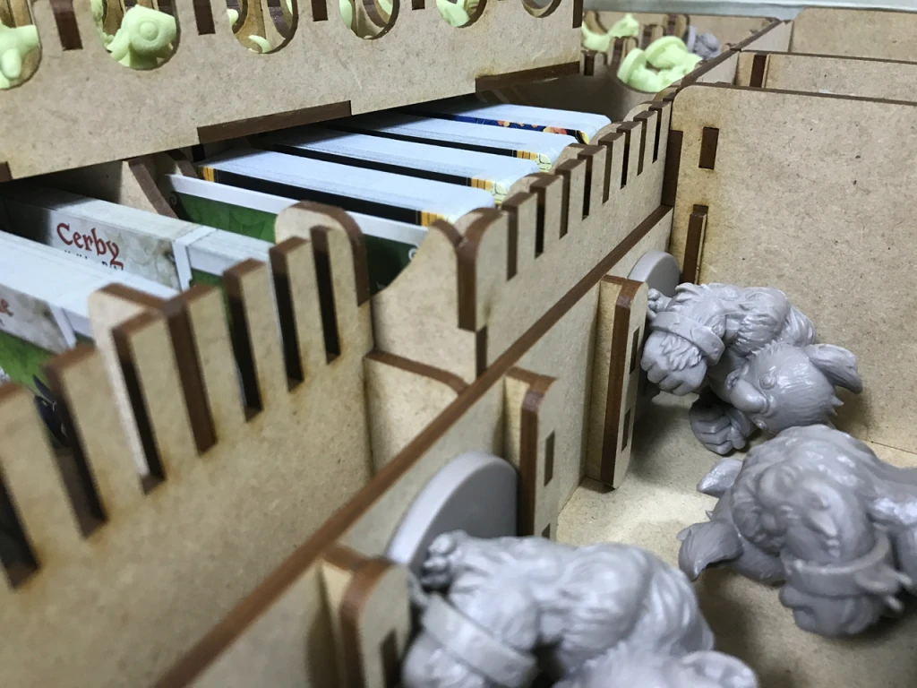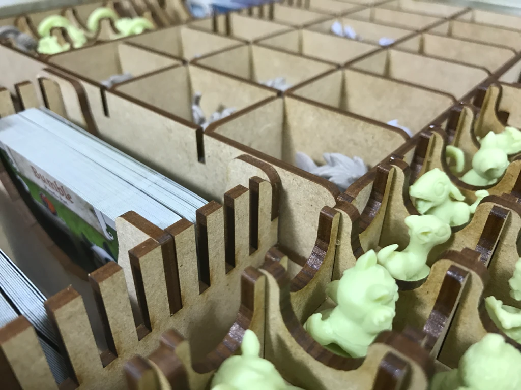 Our storage solution for Arcadia Quest: Inferno Pets provides storage for minis, large cards, small cards, and map tiles in four custom trays.  This solution is designed to be placed in a Pets box.