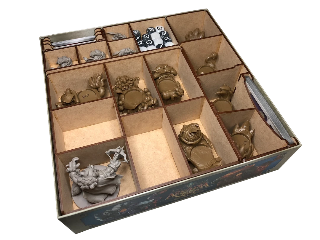 Our storage solution for Arcadia Quest: Riders provides a safe and organized home for your Riders minis, map tiles, cards, campaign pad, dashboards, game manual, and also has room for the two exclusive Kickstarter mounts and dice. We also made sure there was room for the two exclusive game night mounts in case you manage to get your hands on those!