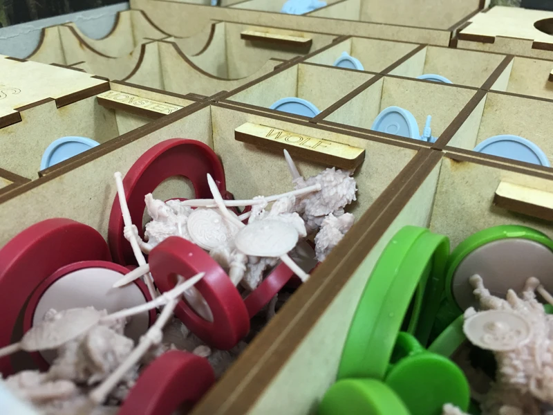 R-A-G-E and blood…  Our BRAGE-001 insert is designed to be compatible with the Blood Rage box from CMON.  This kit consists of 13 storage trays.  All of the trays are removable and many are specifically designed to be pulled out of the box for ease of player setup.  This insert is designed to store your retail or Kickstarter components (all of them).  If you only own the retail game and expansions, you will have an extra player bin and some extra minis space in your completed insert.  If you own everything from the Kickstarter, your insert kit will be totally filled.  The only thing we couldn’t fit into the insert was the optional art book from the Kickstarter…