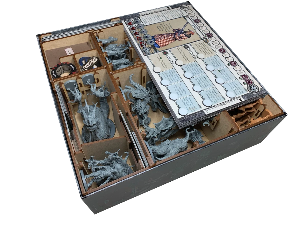 The Go7 Gaming organizer for Cthulhu: Death May Die Season 2/Unspeakable game box provides a storage solution for your minis, tokens, tiles, dice, and more. This solution contains nine (9) trays and includes custom etching to aid you in packing everything up once your gaming session is complete.