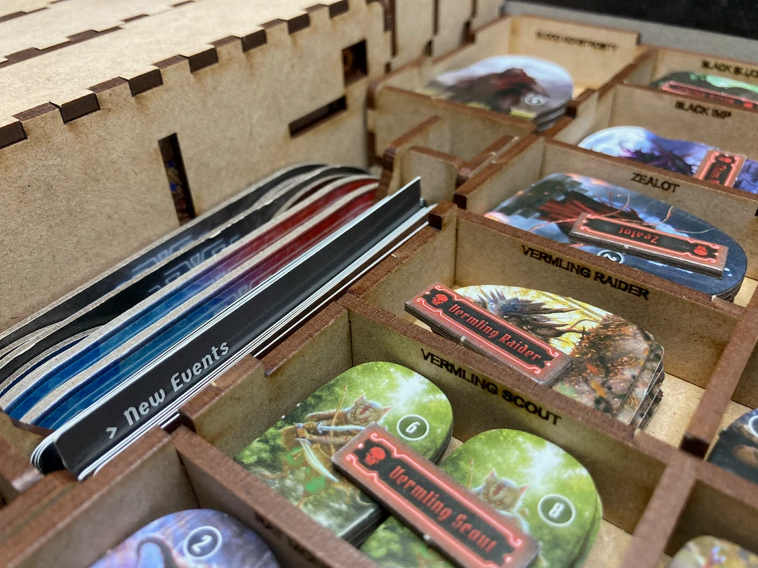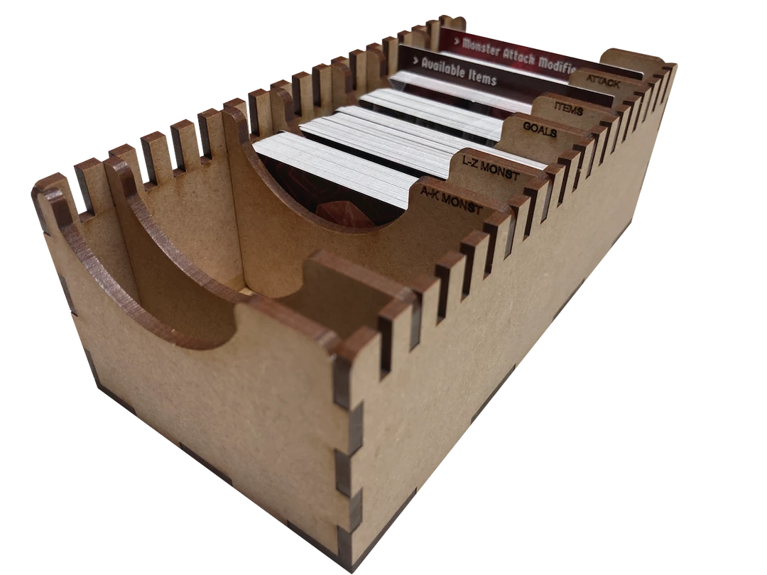 - One (1) small card tray with etched dividers that stores sleeved or unsleeved cards