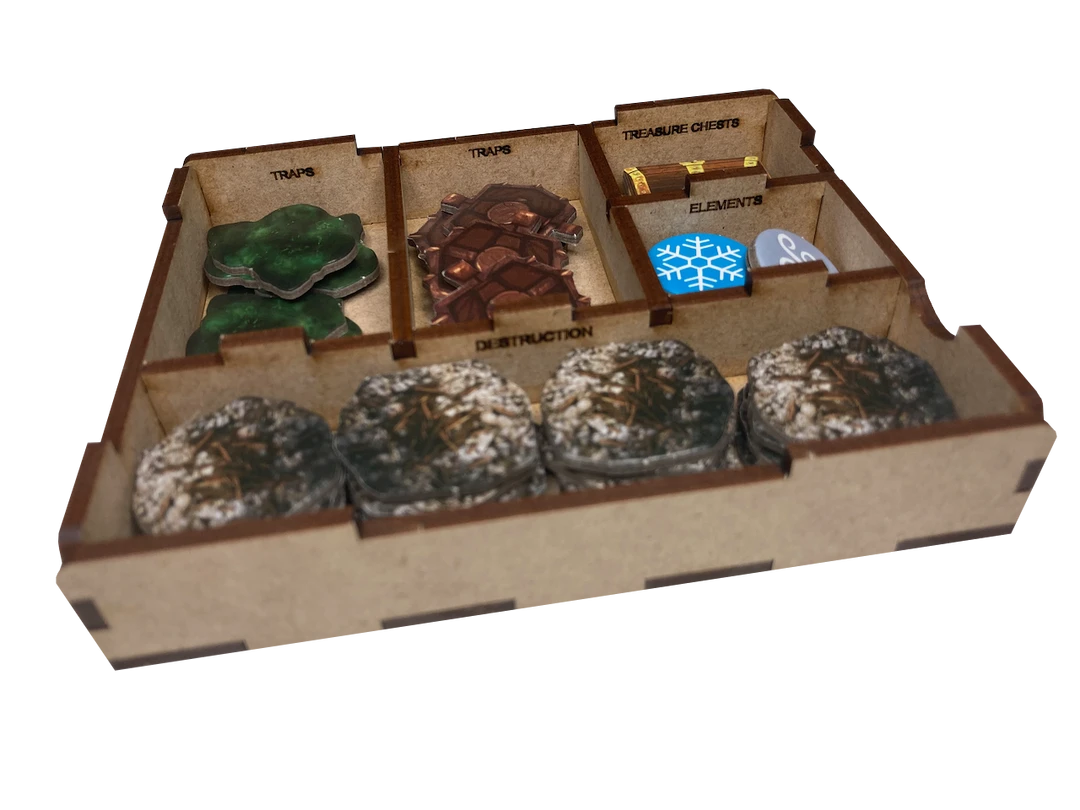 - Three (3) etched token trays providing storage for conditions, damage, money, activation, terrain, traps, treasure chests, and elements (includes lid)