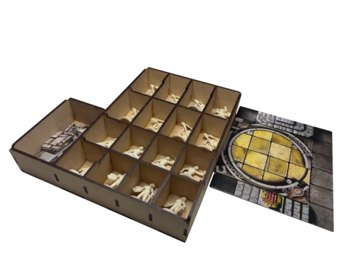 The Go7 Gaming organizer for HeroQuest (2021 edition) provides storage for the base game, Mythic content, and the Keller’s Keep and Return of The Witch Lord expansions.  Our solution uses the base game box to store all components and there are a few open slots to store Commander of the Guardian Knights minis (2) and more!