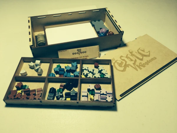 The chest is cut from 3mm HDF.  The HDF provides a very nice feel in hand and the chest has some nice internal features, including support for the TEK Deluxe edition.  On top, the Tiny Epic Kingdoms’ logo is engraved and on the right side (not shown), the Gamelyn Games’ logo is engraved.  After all, logos make everything better!