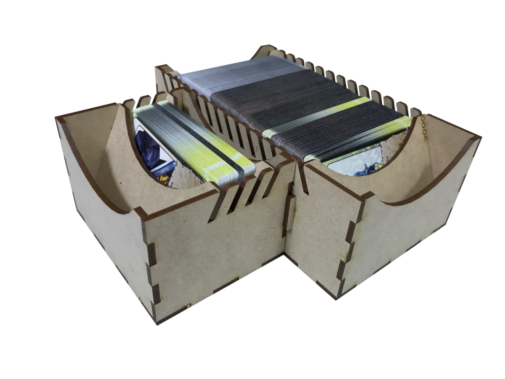 If you build this configuration, you will need to store your long storage trays sideways. This creates significant box lift (~40mm), but allows for a large amount of card storage in this very small box. You can store the instruction manual on top of the trays or under them.
