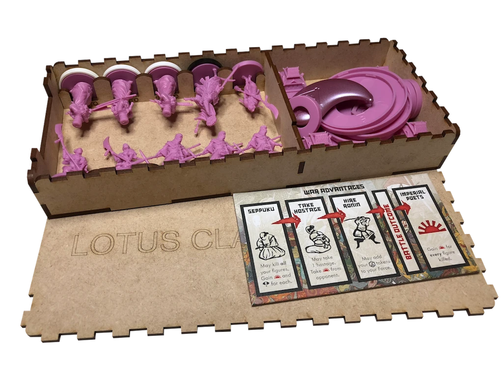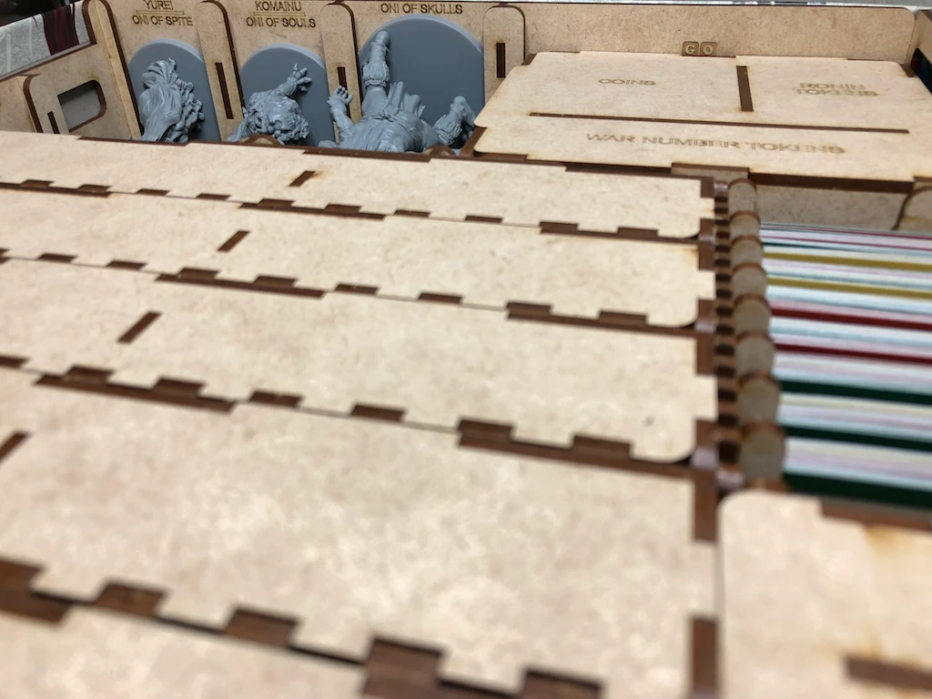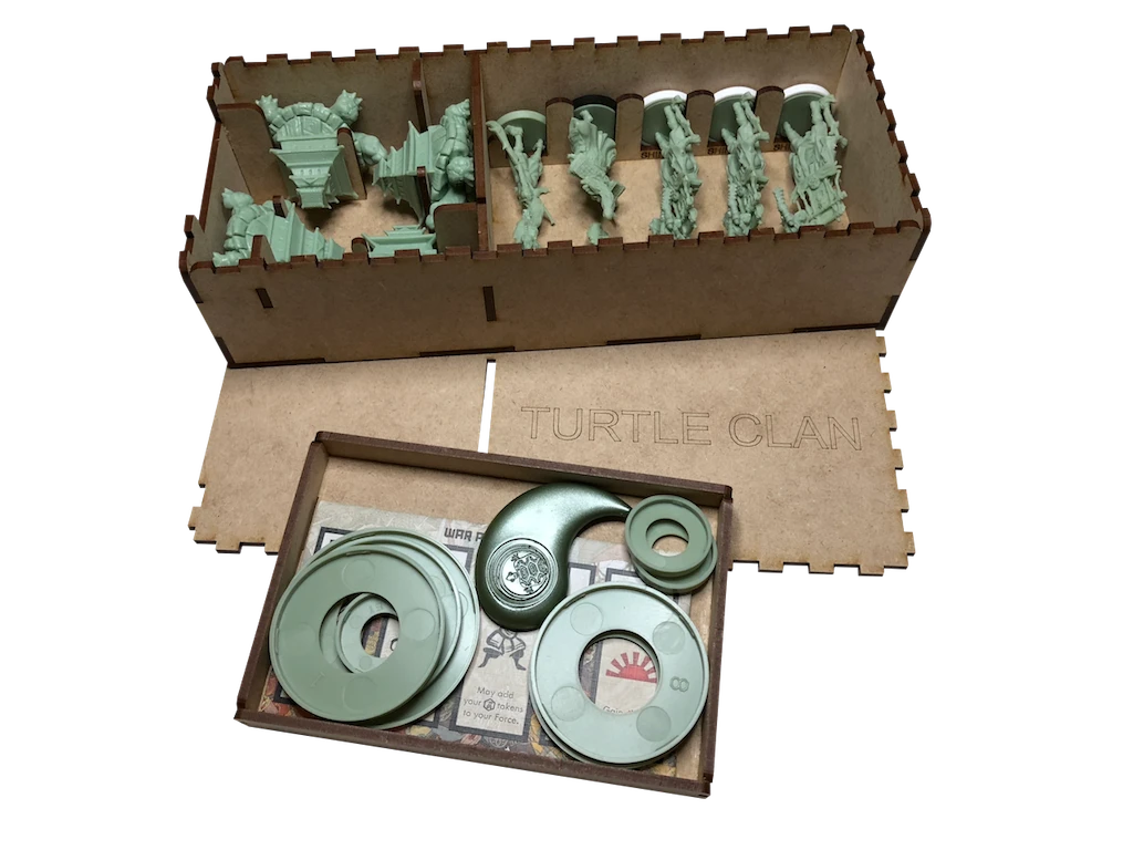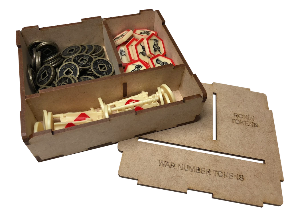 Our storage solution for the Rising Sun™ base game provides a total storage solution for the base game components. This solution includes nine (9) storage trays, five (5) of which are clan storage boxes that storage all clan components.