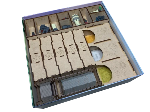 Our organizer for Tapestry provides a structured storage solution that allows you to get the game to the table quicker and includes a tile and card dispenser for use during play. Nine (9) trays are provided in the kit including five (5) player trays to get your game going quickly. Â We provide custom etchings for all landmarks used on the tech trees for fast setup and storage.
