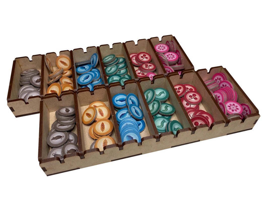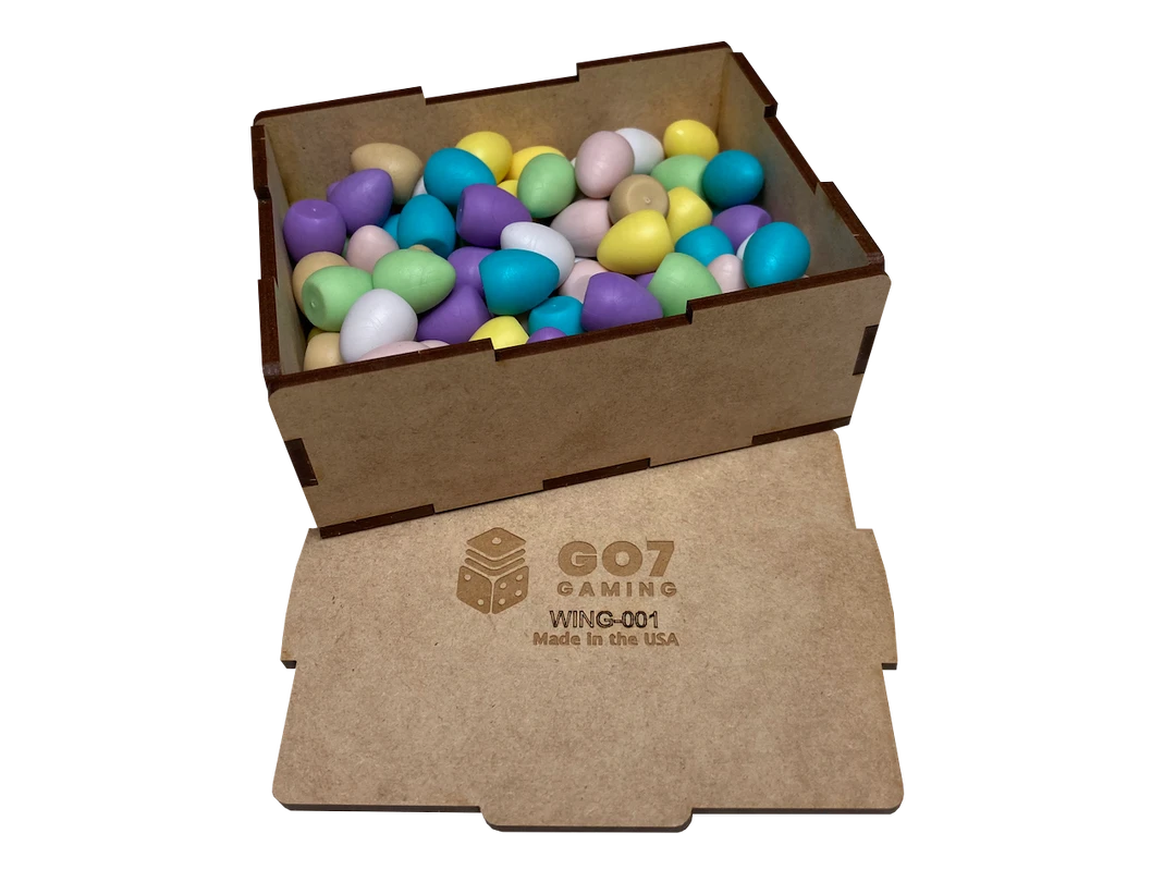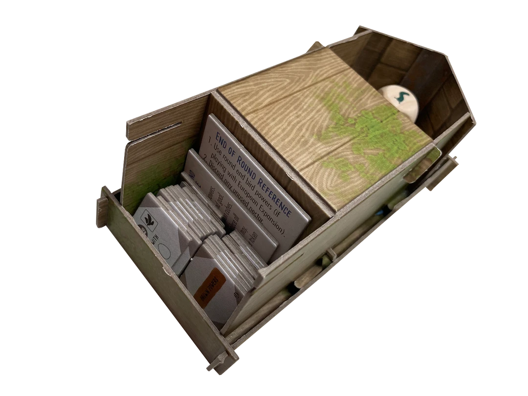 The Go7 Gaming organizer for Wingspan + Wingspan: Oceania + Wingspan:European provides room for your cards, tokens, dice, action cubes, food tokens, player boards (single set only), and birdhouse all in a single box!  Now you won’t need to cart around two or more boxes to get a game in!  Our card trays are designed to replace the plastic lid for card dispensing too!