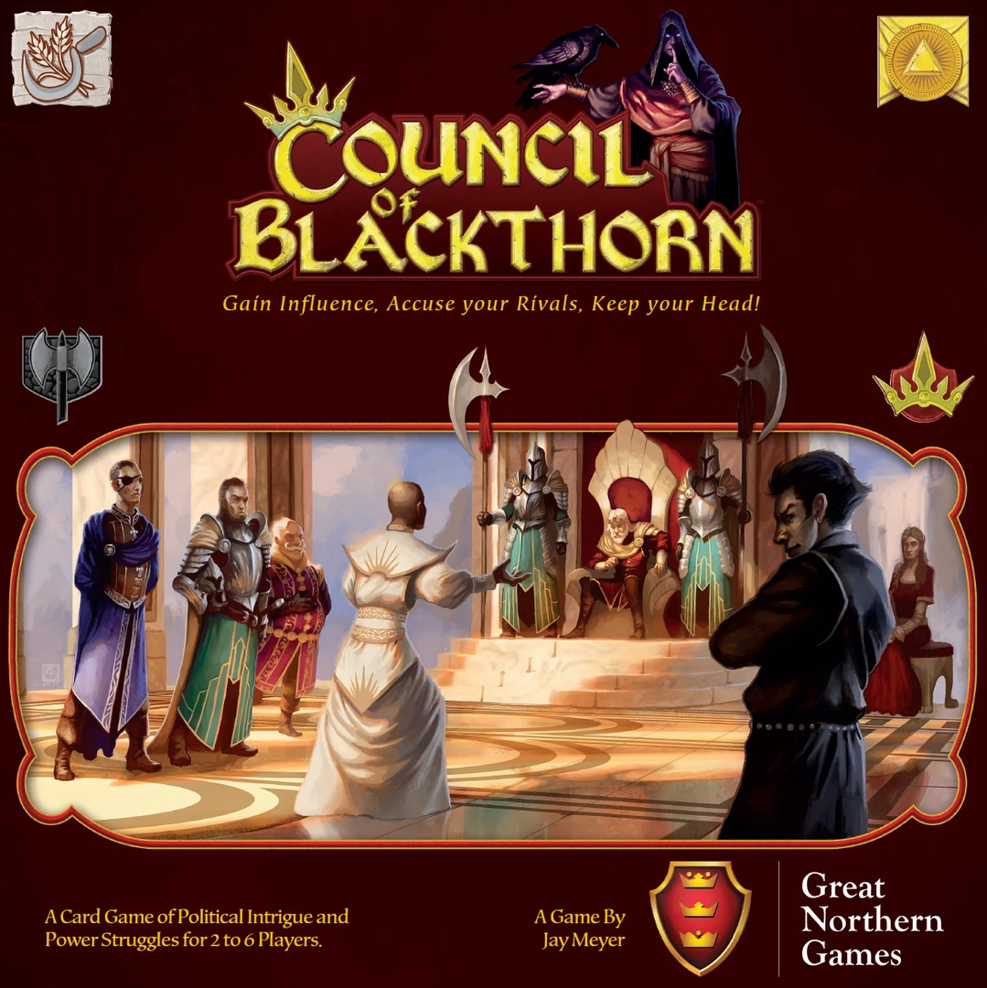 The King of Blackthorn rose to power on the strength of his sword, gaining the devotion of the people as he forged a nation and purged the ravages of war. Once a much needed beacon of strength for a foundling kingdom, he has now grown old and is no longer a vital part of a now robust and powerful country. Others have risen to prominence and power within his council. Adept in their machinations and plots, the councilors have their own self serving ambitions. In a shadowy battle of subterfuge they ruthlessly vie against one another for true control of Blackthorn. In this dance of treachery, each must seize as much power as able without drawing suspicion for whispers of treason echo through the halls of the King of Blackthorn. Whispers from fellow councilors designed to implicate and see the competition shortened by a head. The King will call for the axe for any he deems a traitor and there is always the risk that he is not as ignorant of the schemes as he seems.