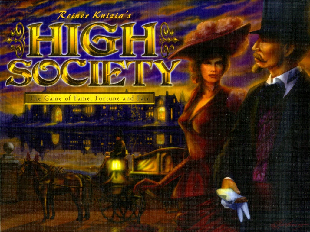 In Reiner Knizia’s High Society, players bid against each other to acquire the various trappings of wealth (positive-number and multiplier cards) while avoiding its pitfalls (negative number and divisor cards). While bidding, though, keep an eye on your remaining cash – at the end of the game, even though all those positive-number cards might add up to a win, the player with the least money isn’t even considered for victory.