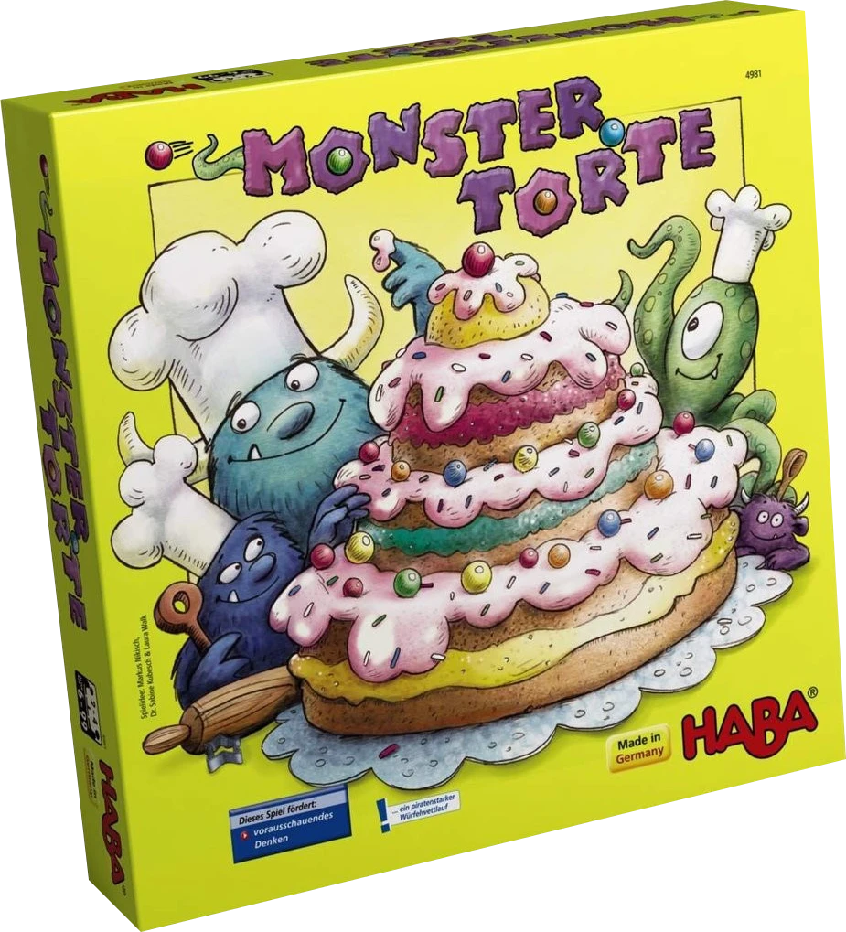 To set up Monstertorte, place all of the ingredients – wooden balls in six colors – in the mixing bowl, that is, the box bottom. On a turn, one player reveals a cake card, then all the assistant chefs use their wooden spoons to scoop out the proper ingredients and assemble them in their individual bowl. The first player to do this wins the card, and the first player to collect five cards wins.