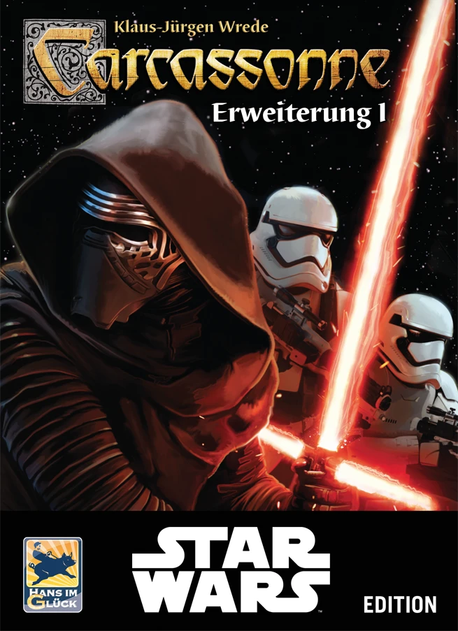 Carcassonne: Star Wars – Erweiterung 1 is an expansion for Carcassonne: Star Wars that includes 18 new space tiles featuring First Order faction symbols plus 6 scoring tiles as well as components for a sixth blue player (Kylo Ren).