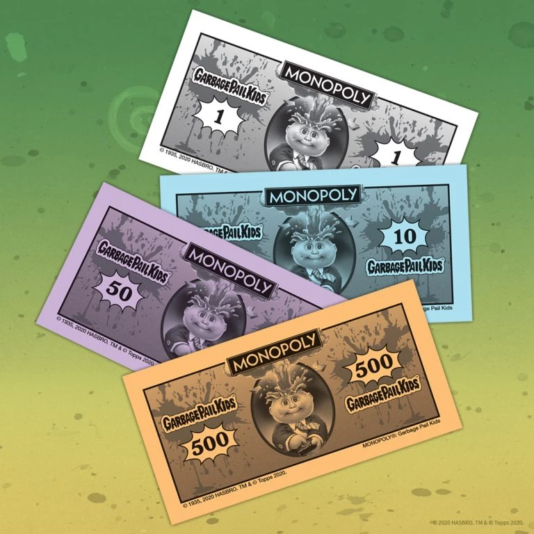 Relive the classic trading card game in a whole new way with MONOPOLY®: Garbage Pail Kids. Featuring authentic licensed characters fans know and love. Collectible tokens include the Zit Goo Tube, Melting Eyeball, and Swirly Dog Poop as players move around the board to collect the iconic Garbage Pail Kids.