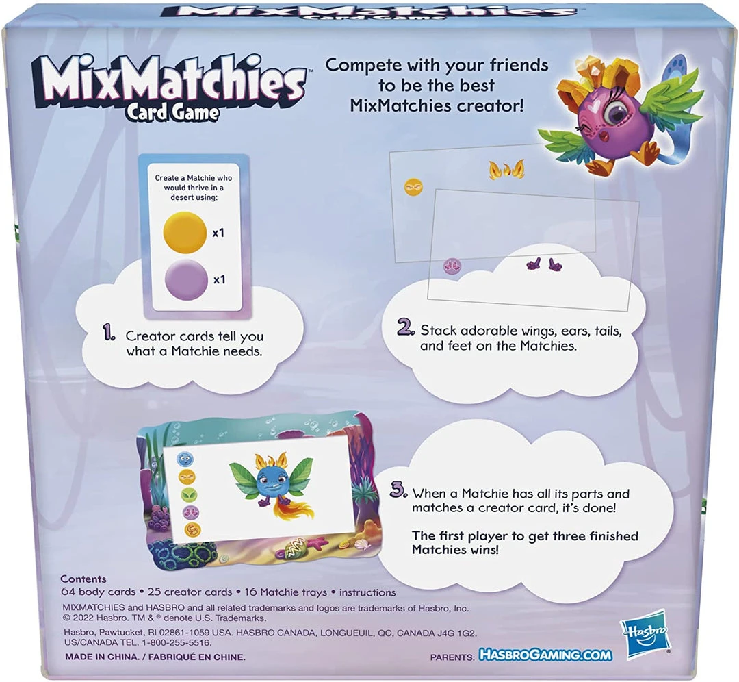 In the MixMatchies Card Game, players compete with their friends to be the best MixMatchies creator. Follow the creator cards to see what kinds and colors of body cards the Matchies need. But remember — a Matchie only becomes complete when it matches a creator card and has ears, wings, feet, and a tail — so adorable! The first player to complete 3 Matchies wins. Kids ages 8 and up can enjoy creating Matchies with friends. It’s a whimsical and fun family game for 2 to 6 players. Hasbro Gaming and all related trademarks and logos are trademarks of Hasbro, Inc.