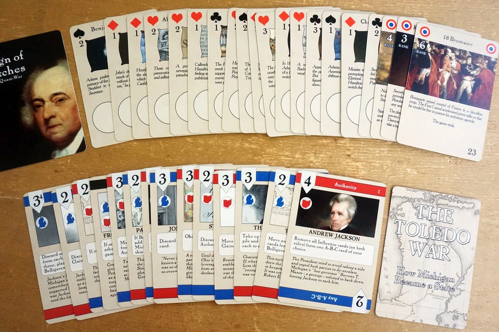 The Toledo War is about Michigan’s conflict with Ohio over the Toledo Strip. Cards are played either as an event or for influence in one of three categories: Authority (support from the federal government), Belligerence (chest-thumping and provocative acts of violence to fire up your base), and Claim (legal pretexts). The game ends when the cash-strapped territory of Michigan capitulates, holding an illegal convention in the dead of winter – the “Frostbitten Convention” – so as to qualify for federal aid. In exchange for “losing” the war and Toledo, Michigan gains the resource-rich Upper Peninsula; in a way, both sides can claim victory. Therefore the player with the highest score wins the game.