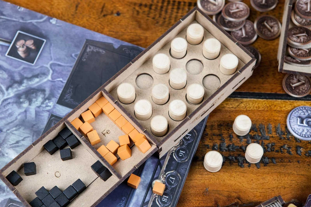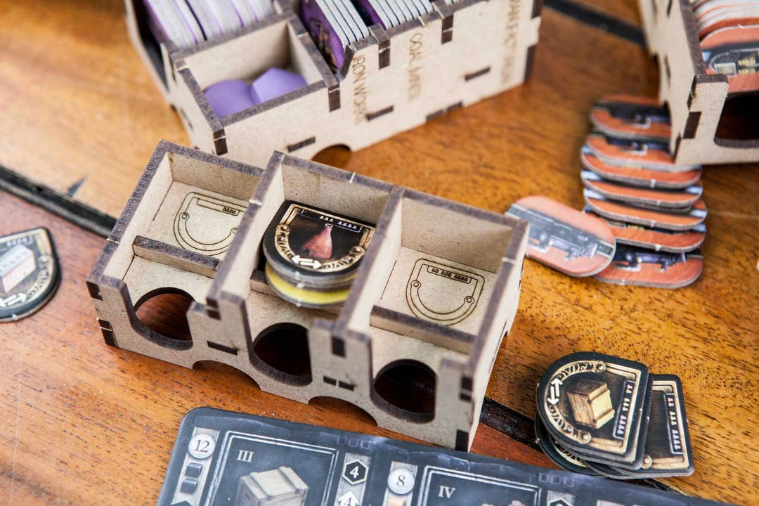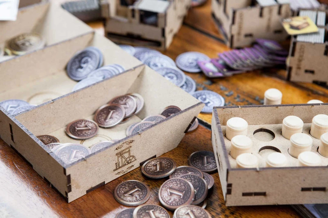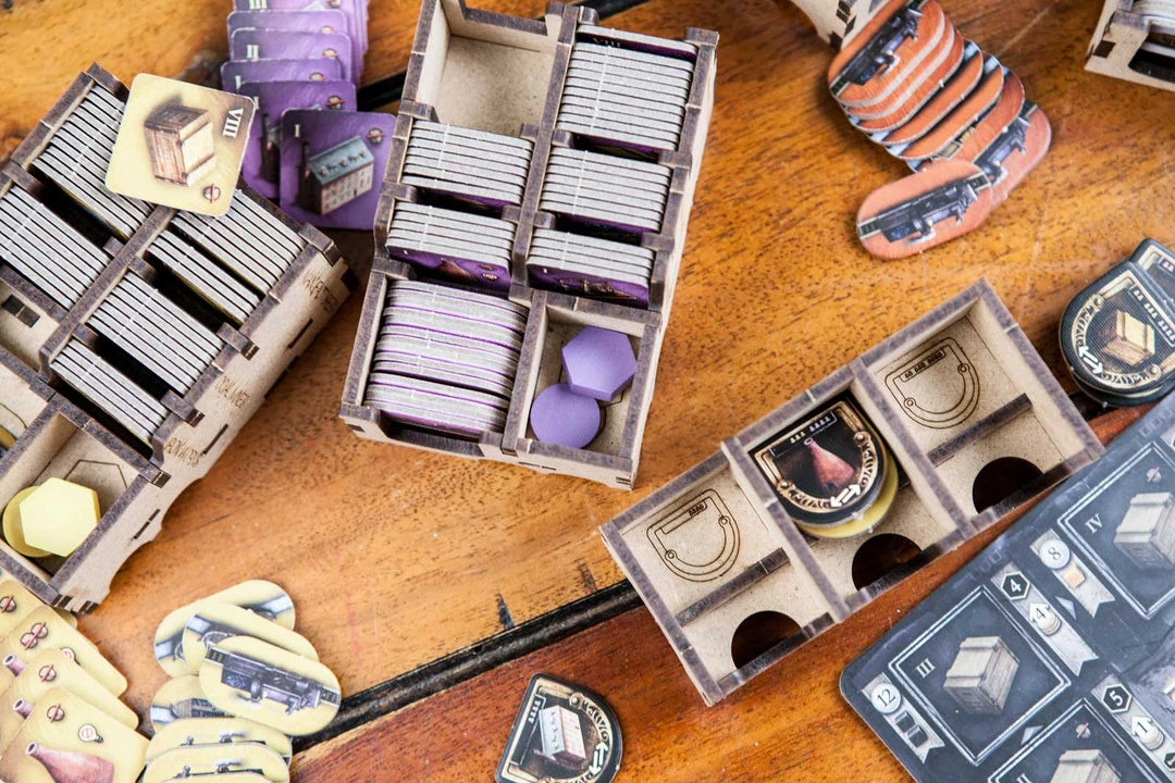 • 4x player set boxes. Slots for buildings divided by type; canals/rails; markers. Bottom slot for character token;