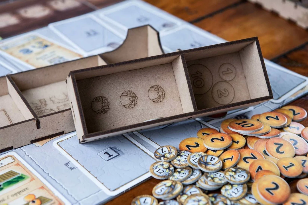 • 1x card and token holder, with spaces for begging tokens, first player token, 5th dwarf etc;
