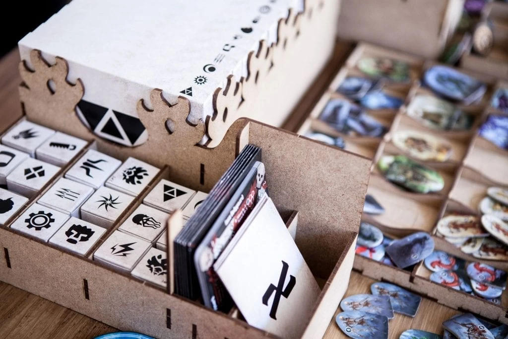 • 2x boxes with slots for map setup tokens – spaces for each type of token (19 carved hostings with guides for a correct placement of all tokens);