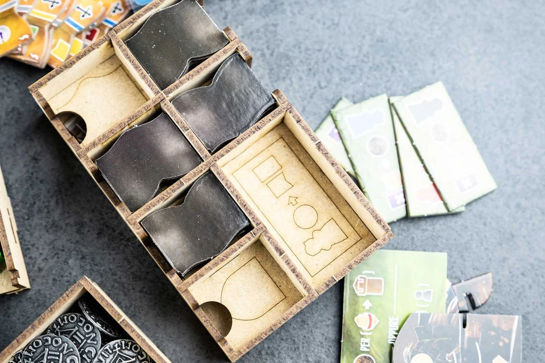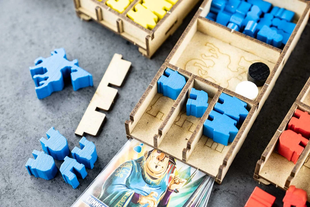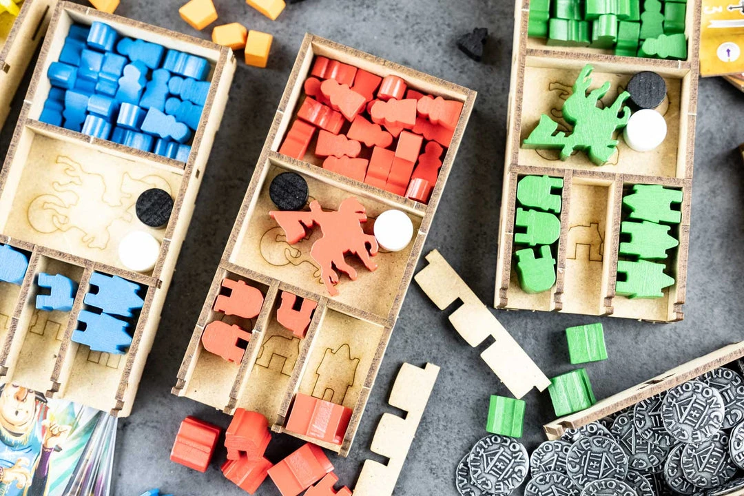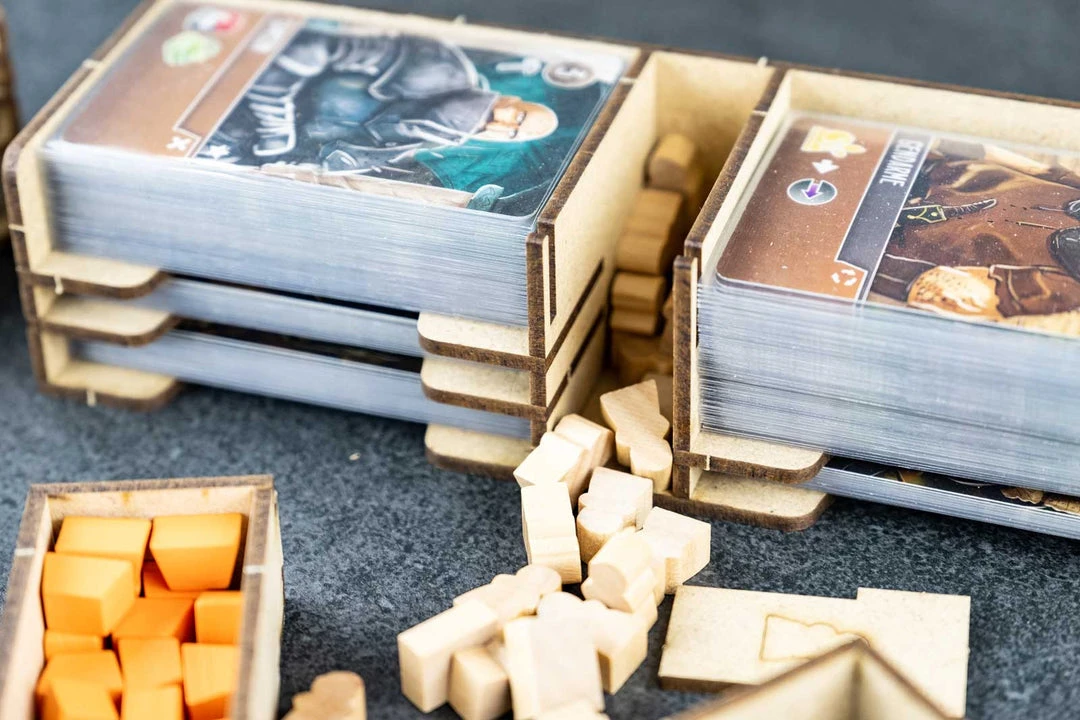 - 3x card holders with dedicated slots and guide engravings. Slot for neutral workers and markers;