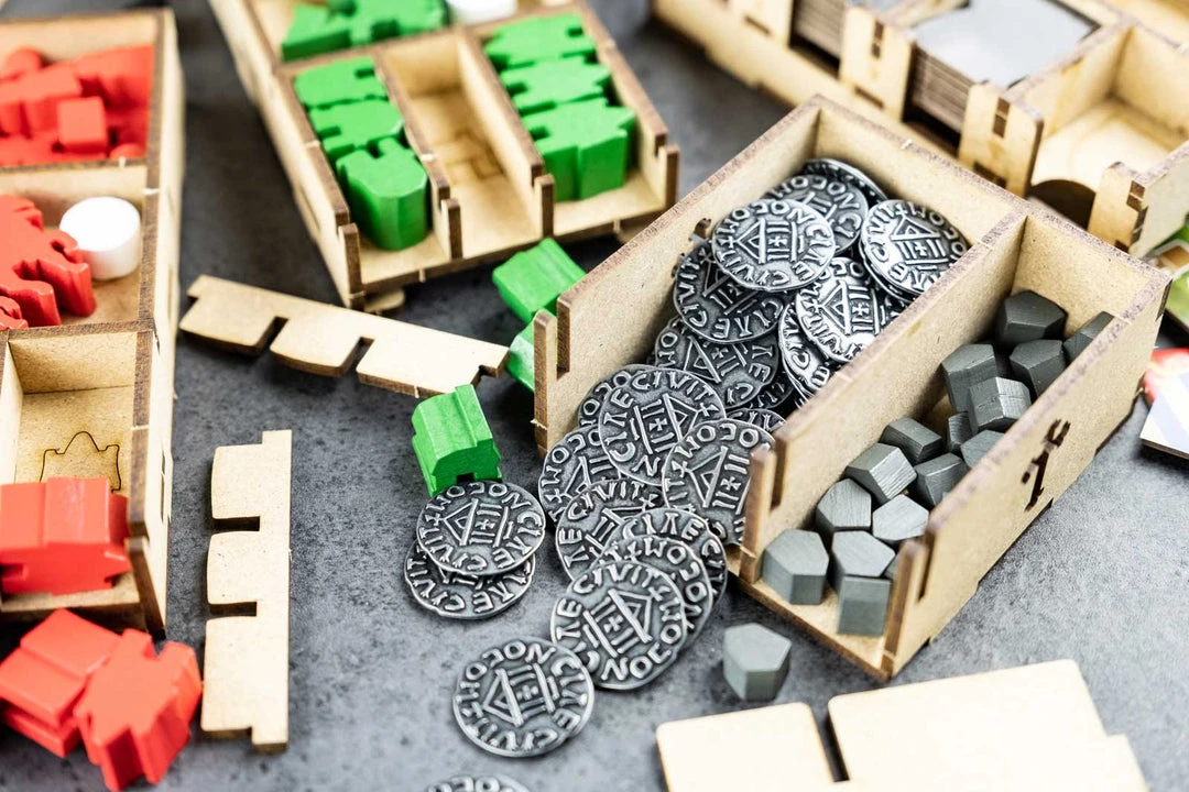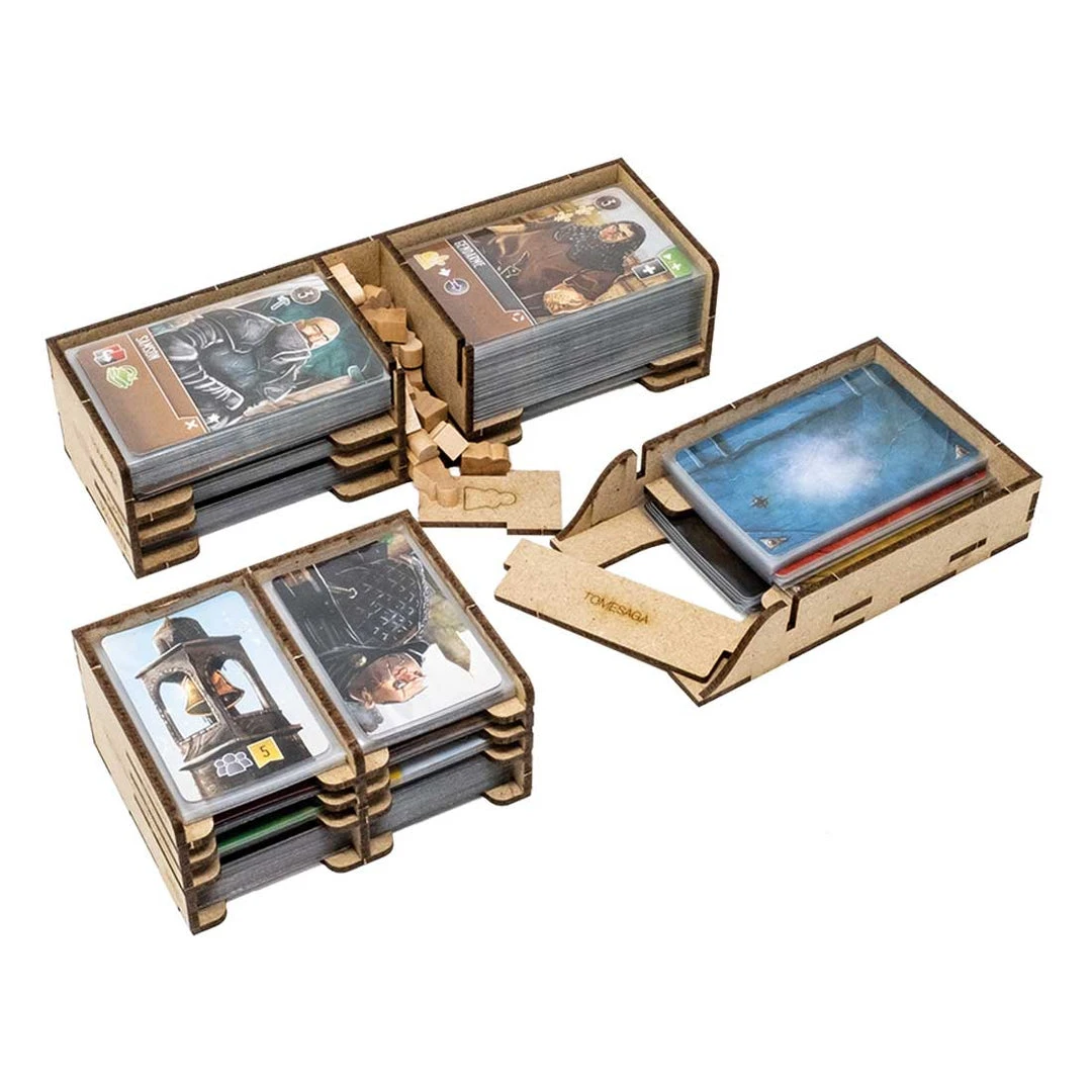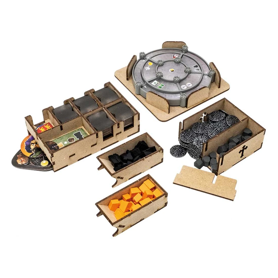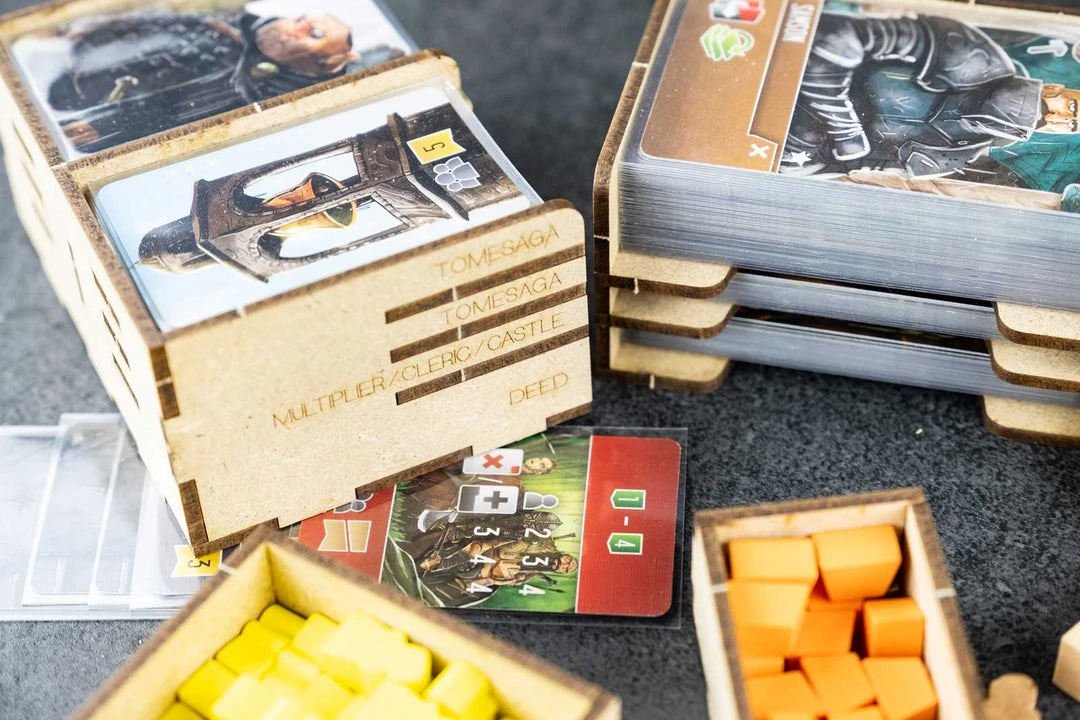 - 3x card holders with dedicated slots and guide engravings. Slot for neutral workers and markers;